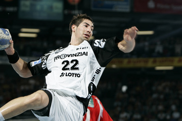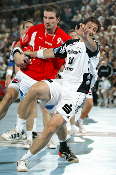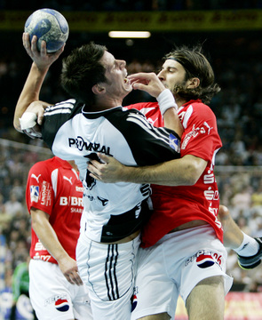 | Nikola Karabatic wird attackiert. | Noka Serdarusic. | Kim Andersson wird attackiert. | Nikola Karabatic. | |||