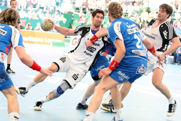 | Nikola Karabatic im Angriff. | Filip Jicha. | Rudelbildung. | Filip Jicha. | |||