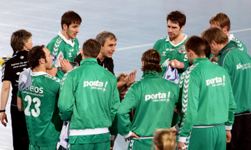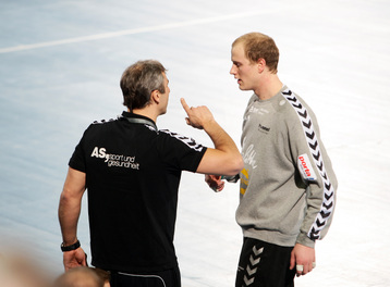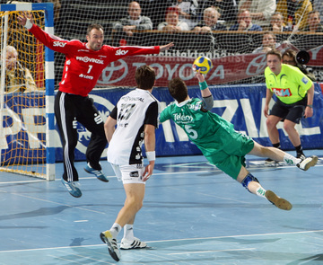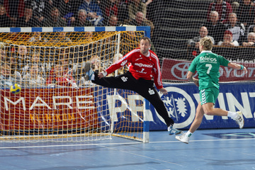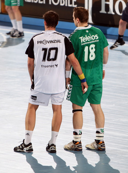 | Lövgren und Just. | Michael Hegemann. | Stefan Lövgren beim Strafwurf. | Jan Fiete Buschmann. | |||