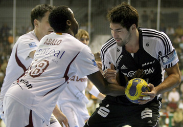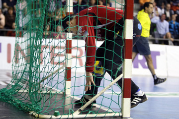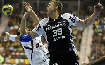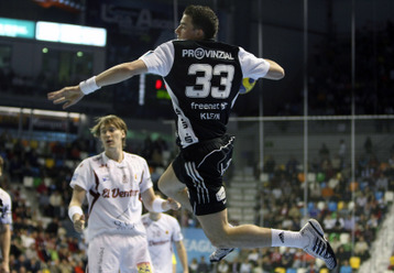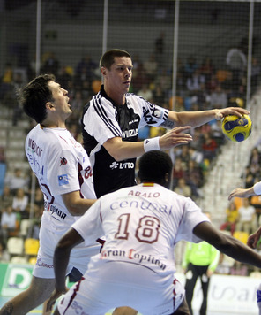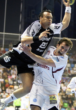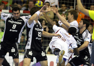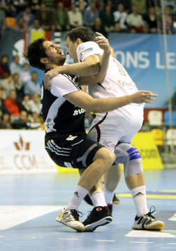 | Talant Dushjebaev. | Spielszene. | Zufriedenheit nach dem Spiel. | Abalo gegen Karabatic. | |||