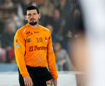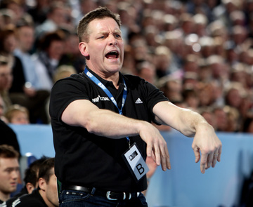| Olafur Stefansson beim Strafwurf. | Arpad Sterbik. | Warmmachen. | Warmmachen. | |||