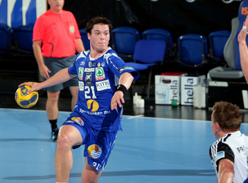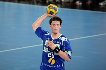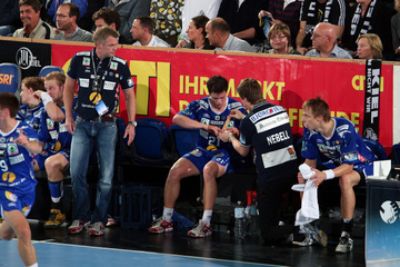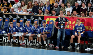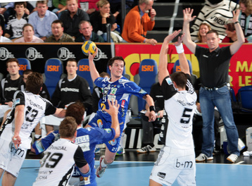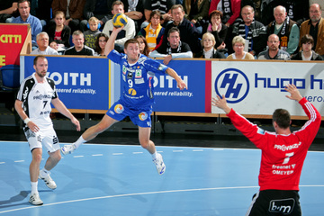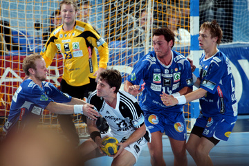 | Alfred Gislason. | Marcus Ahlm am Kreis. | Thierry Omeyer. | Abwehrarbeit. | |||