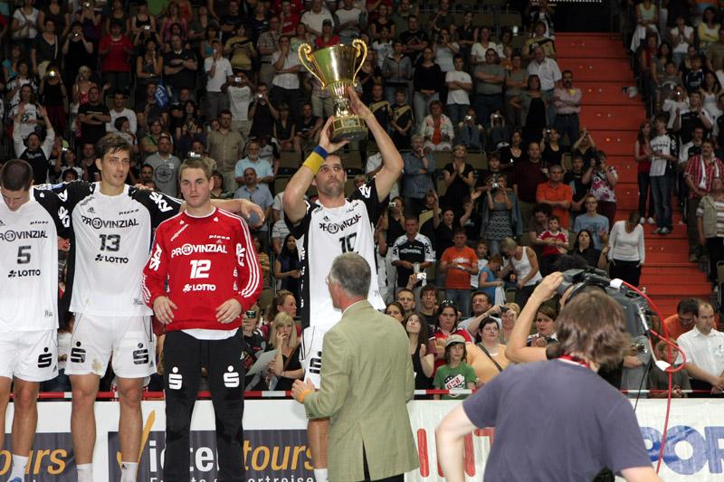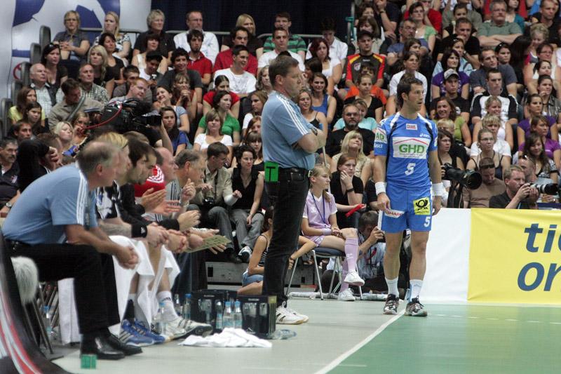 | Supercup 2008: HBL-Vorstand Rainer Witte beglückwünscht Nikola Karabatic zum Olympiasieg. | Supercup 2008: HSV-Trainer Martin Schwalb. | Supercup 2008: Vid Kavticnik. | Supercup 2008: Hendrik Lundström. | |||