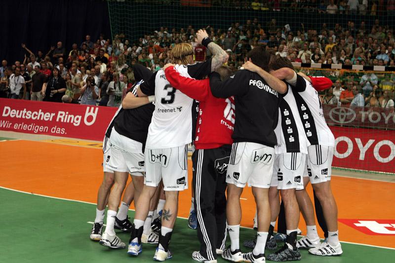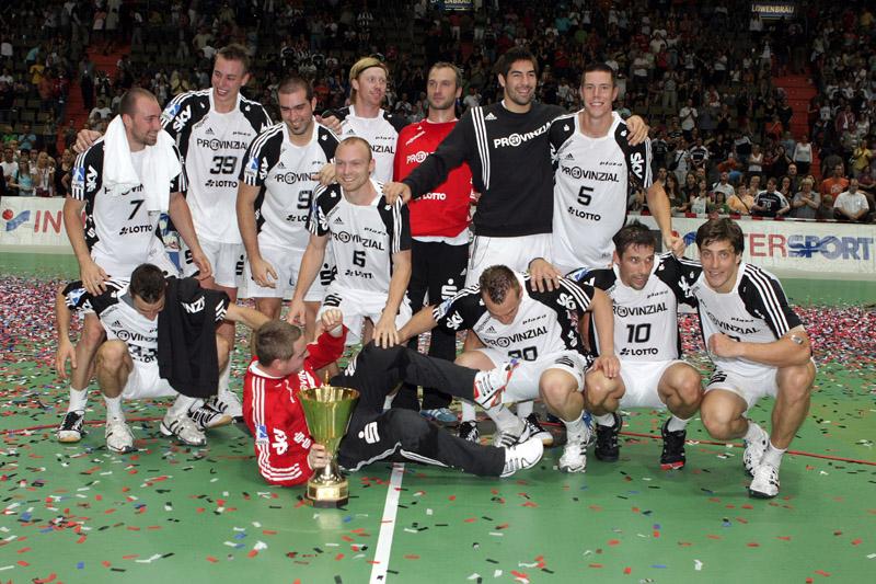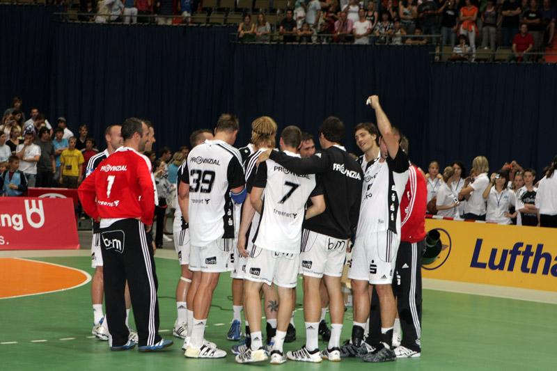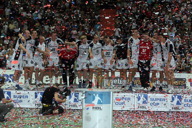 | Supercup 2008: Einlauf der Zebras. | Supercup 2008: Einlauf der Zebras. | Supercup 2008: Alfred Gislason. | Supercup 2008: HBL-Vorstand Rainer Witte beglückwünscht Thierry Omeyer zum Olympiasieg. | |||