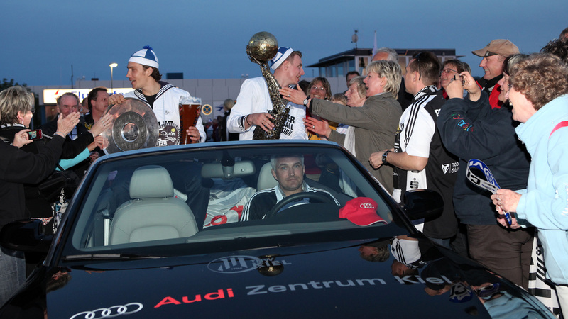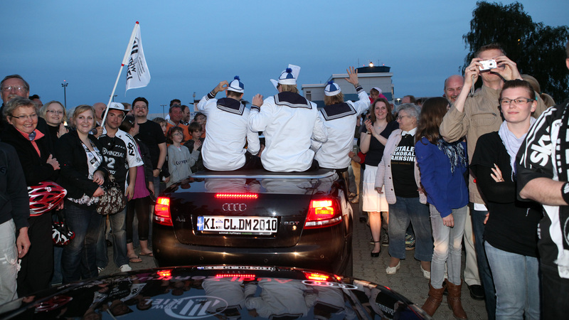 | Deutscher Meister 2010! | Flug nach Kiel. | Ehrenrunde über dem Rathausplatz. | Flug nach Kiel. | |||