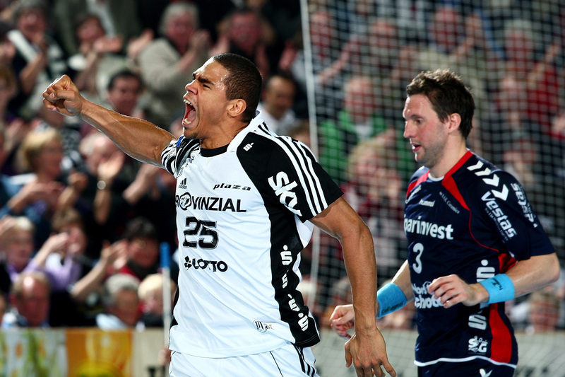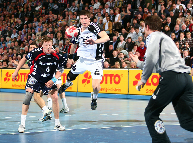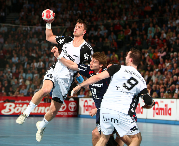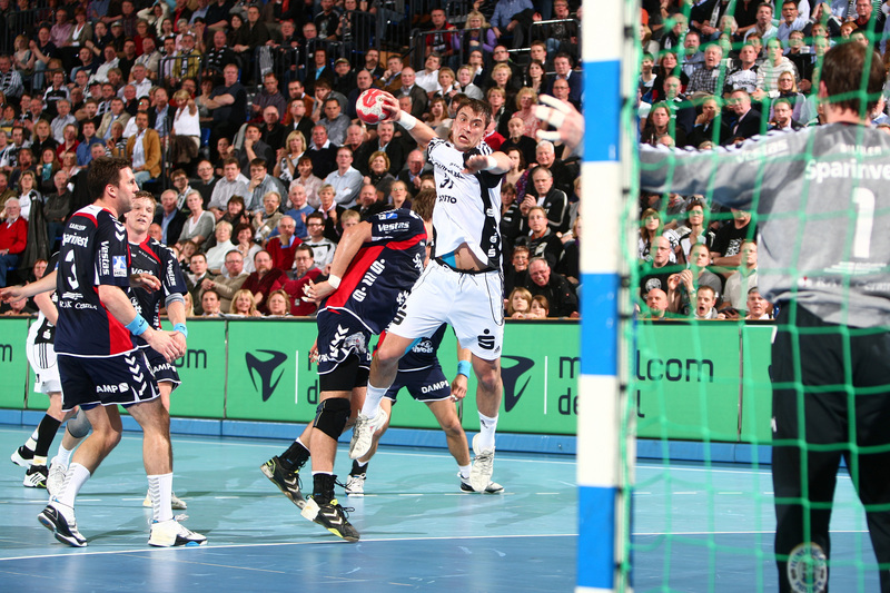 | Marcus Ahlm und Alfred Gislason. | Flensburgs Trainer Per Carlen. | Momir Ilic und Tobias Karlsson. | Filip Jicha und Tobias Karlsson. | |||