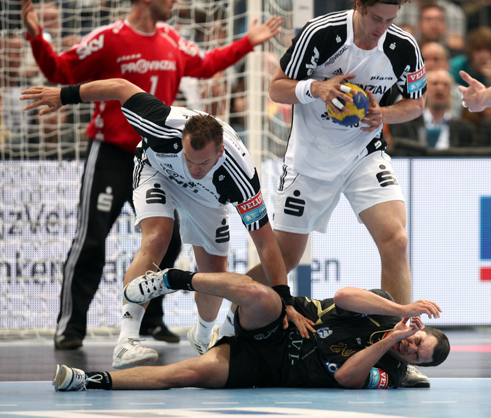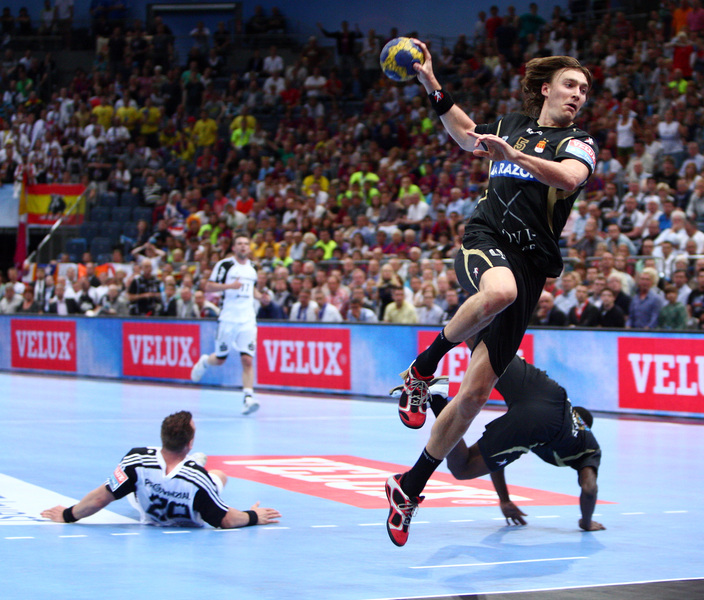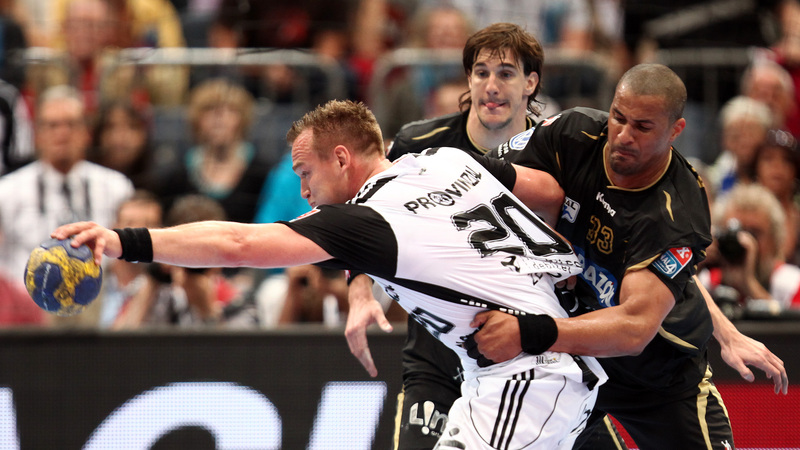 | EHF-Generalsektretär Wiederer und EHF-Präsident Lian. | Die Lanxess arena in Köln. | Einlauf der Teams. | Didier Dinart attackiert Christian Zeitz. | |||