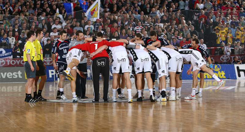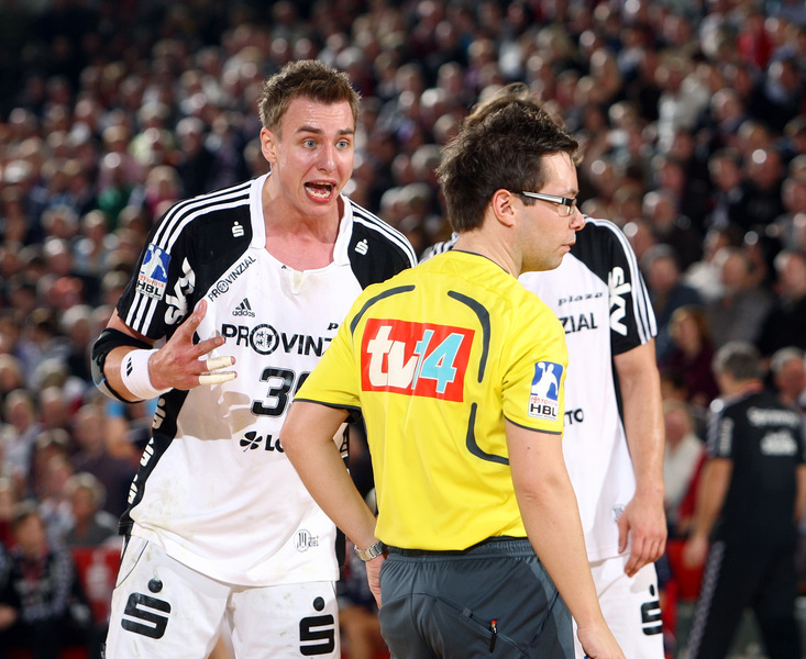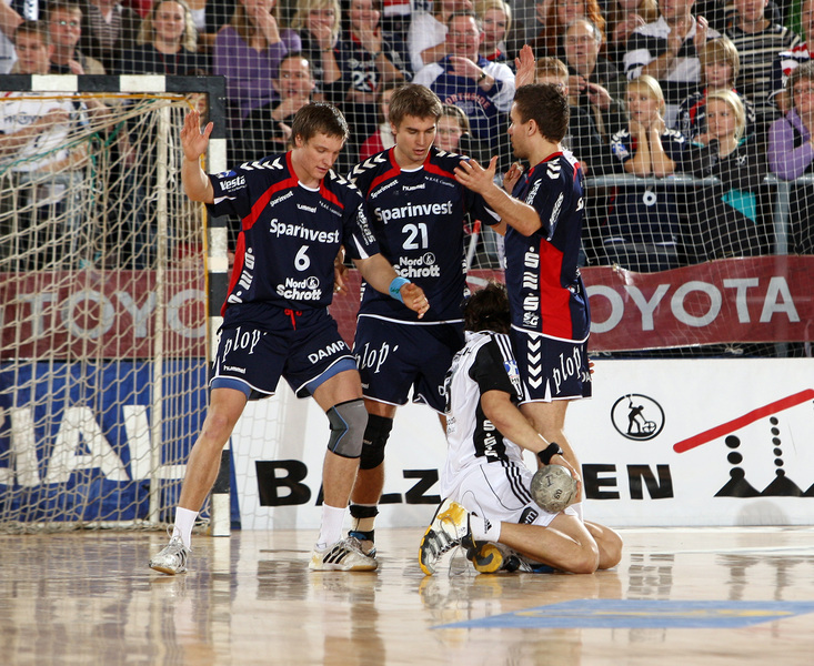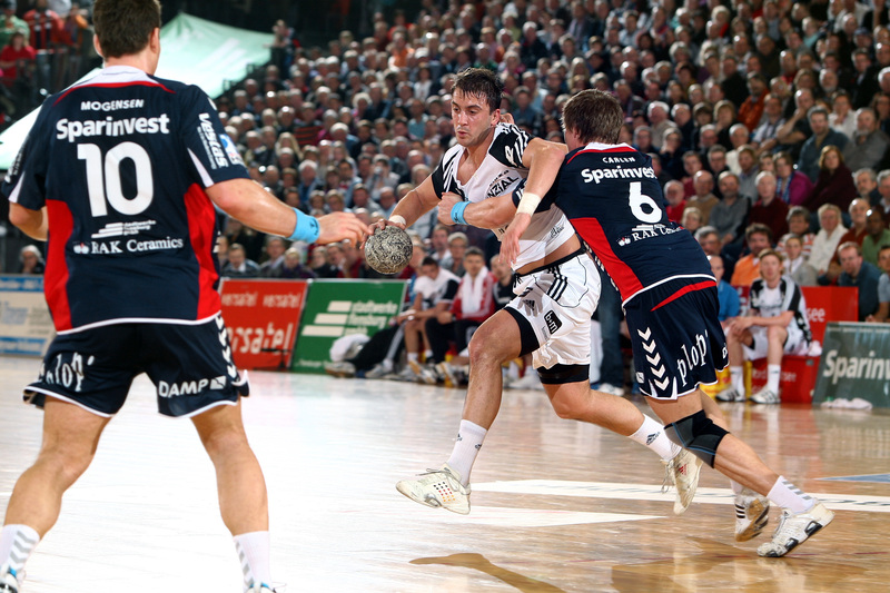 | Die Kieler Deckung packt zu. | Lars Christiansen vs. Thierry Omeyer. | Vor dem Spiel. | Spielszene. | |||
