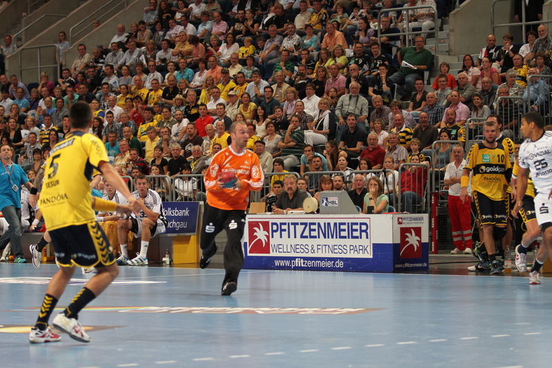 | Thierry Omeyer stürmt Richtung Löwen-Tor. | Daniel Narcisse. | Dominik Klein. | Börge Lund und Christian Zeitz. | |||