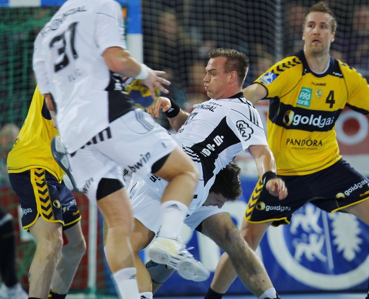 | Filip Jicha. | Patrick Groetzki. | Andy Schmid wird attackiert. | Gudmundur Gudmundsson und Tomas Svensson. | |||
